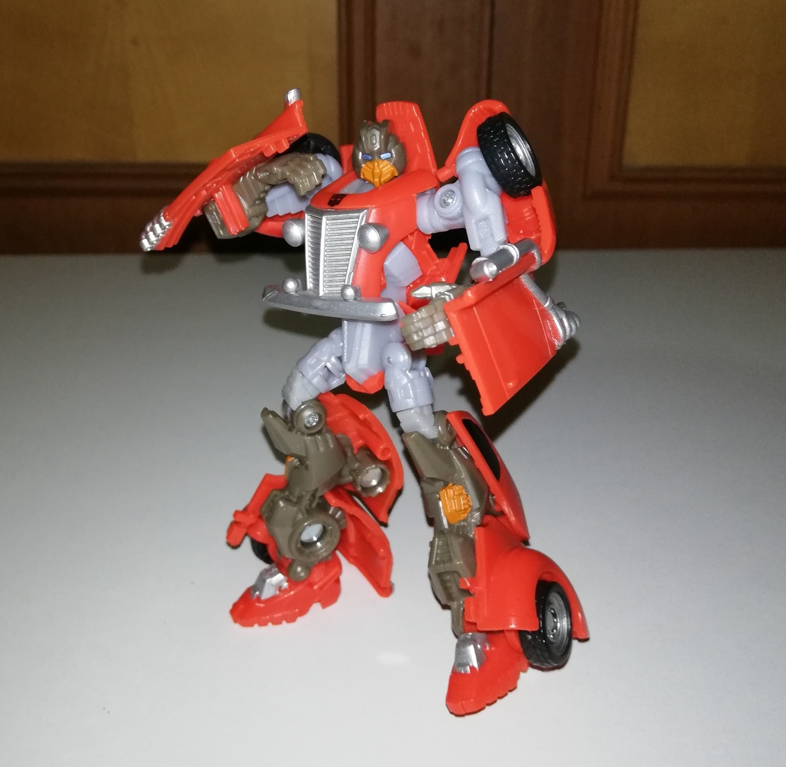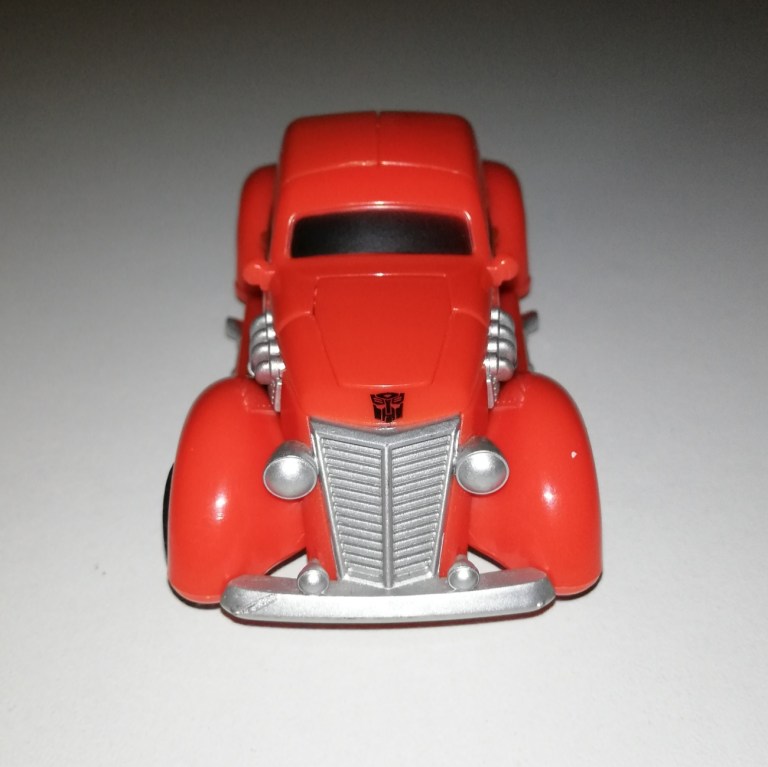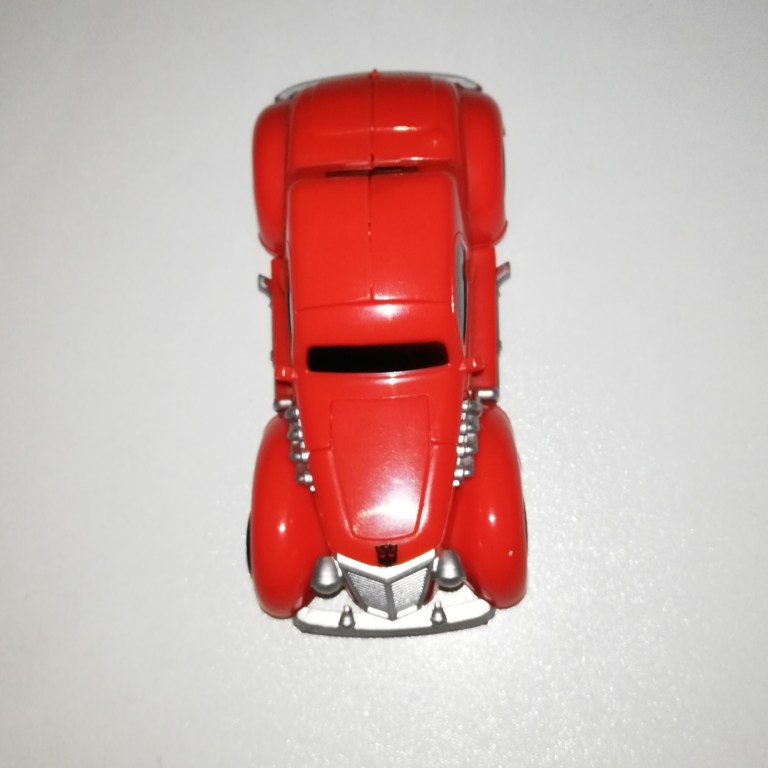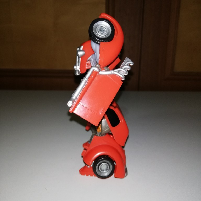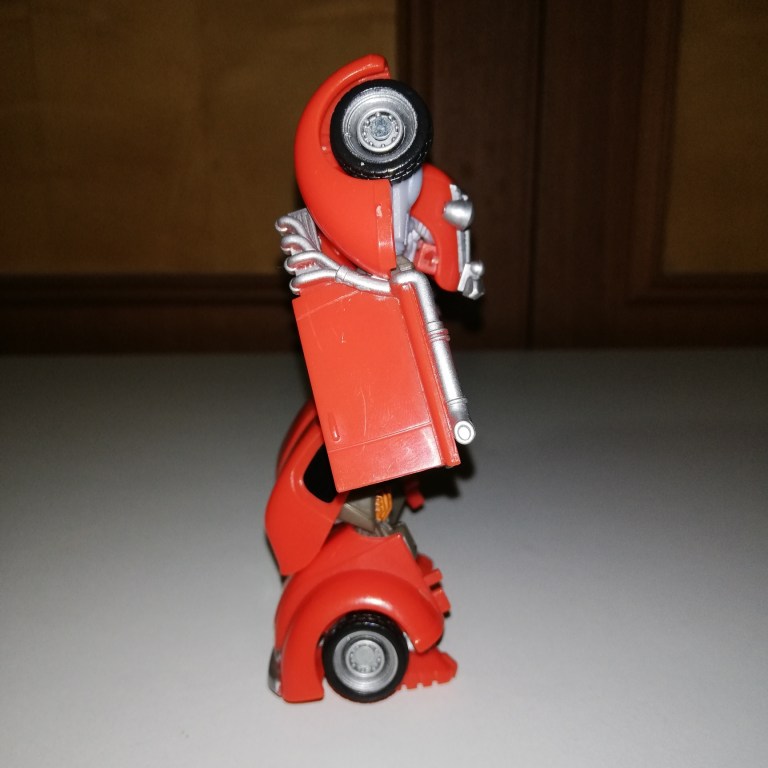 He’s red and turns into a hot rod! The actual Bayverse Hot Rod is black and turns into a Lambo.