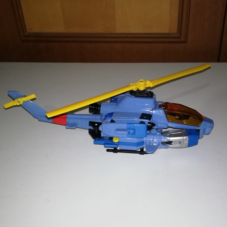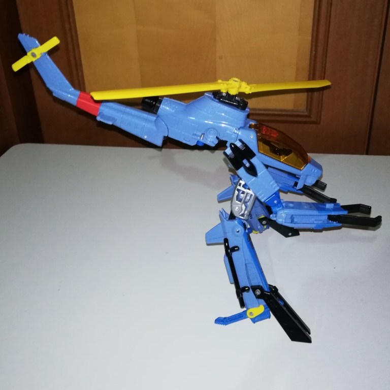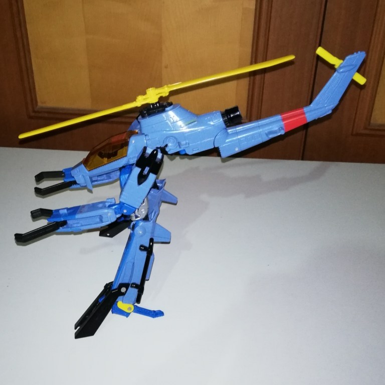 Whirl turns into a pretty nice looking attack helicopter. He has skis instead of landing gear and a rocket on his back.