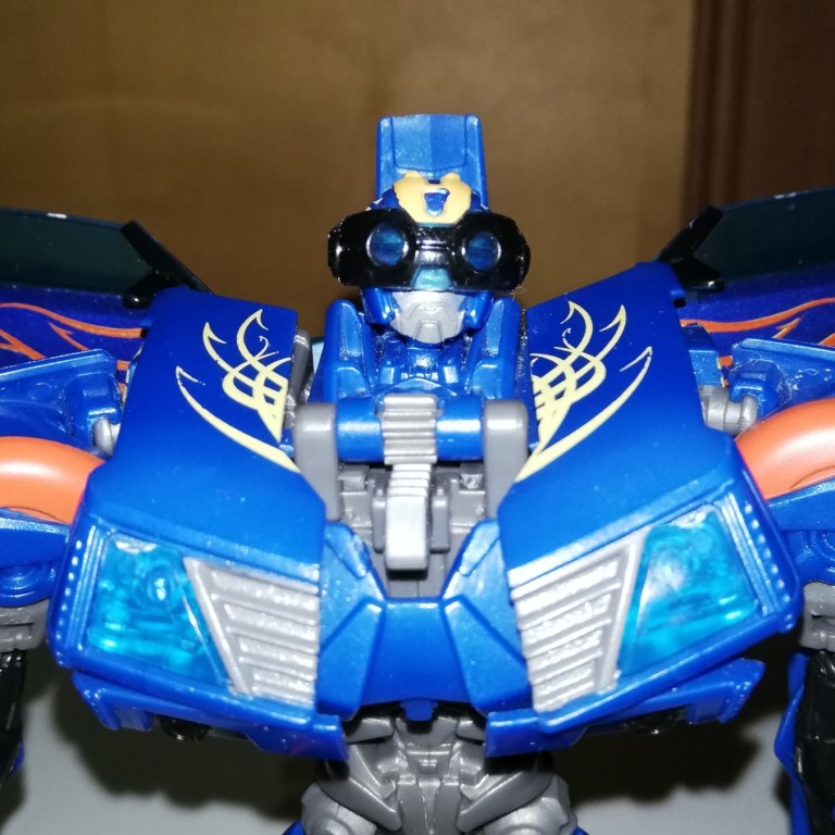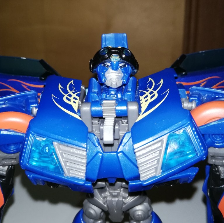Hot Shot has a really cool headsculpt. His eyes are confusing. At first you think they’re the silver parts but nope. The translucent blue underneath the silver, those are his eyes. Also, he has goggles. And they flip down!