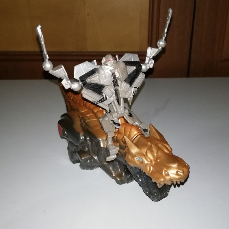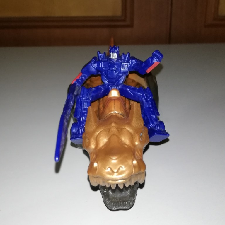 Optimus sits on Grimlock securely enough and his sword sticks out far enough for him to joust.