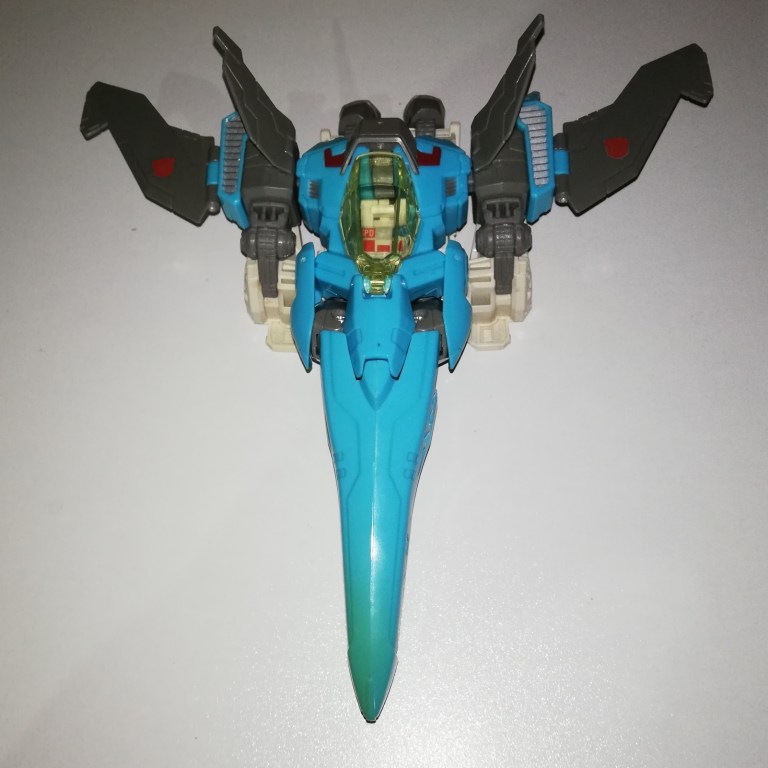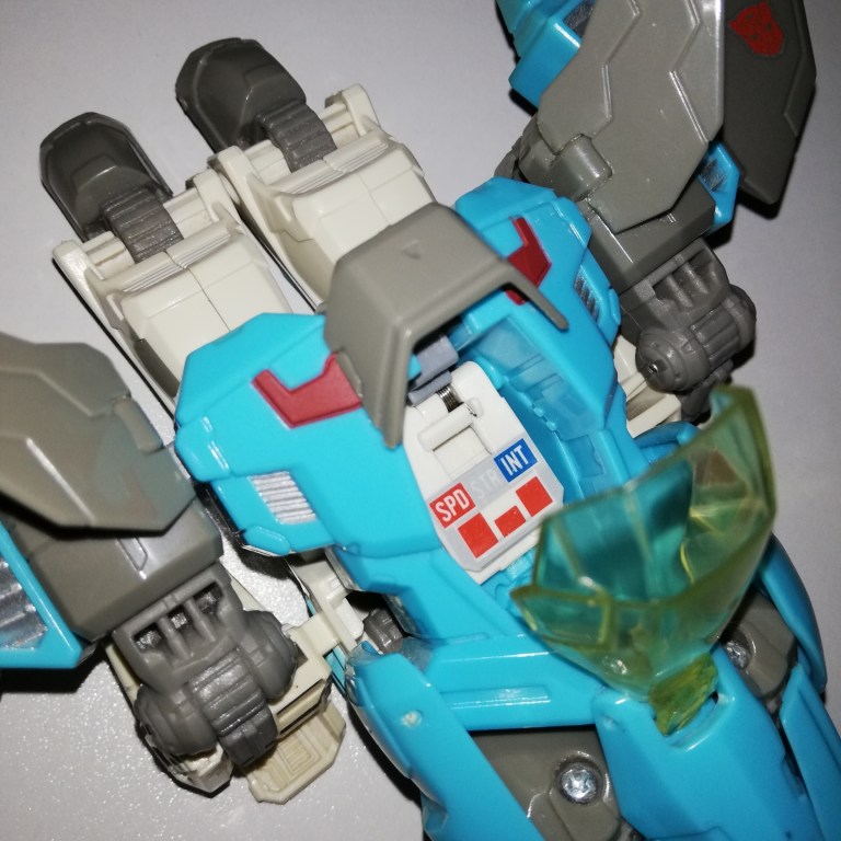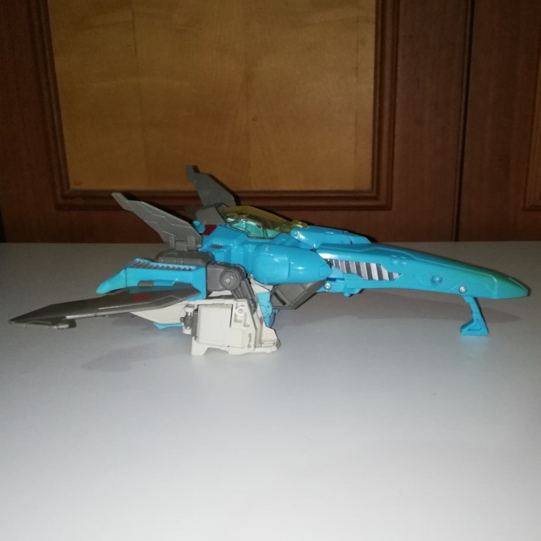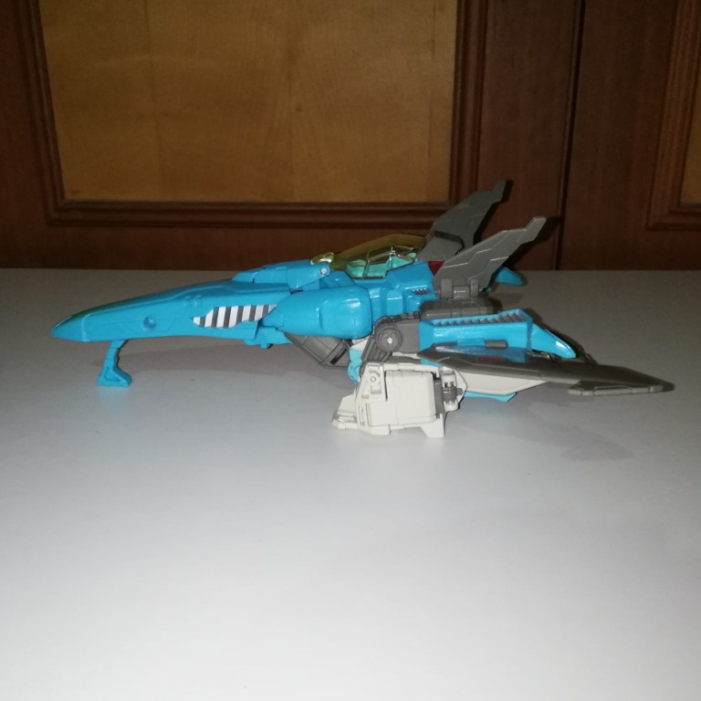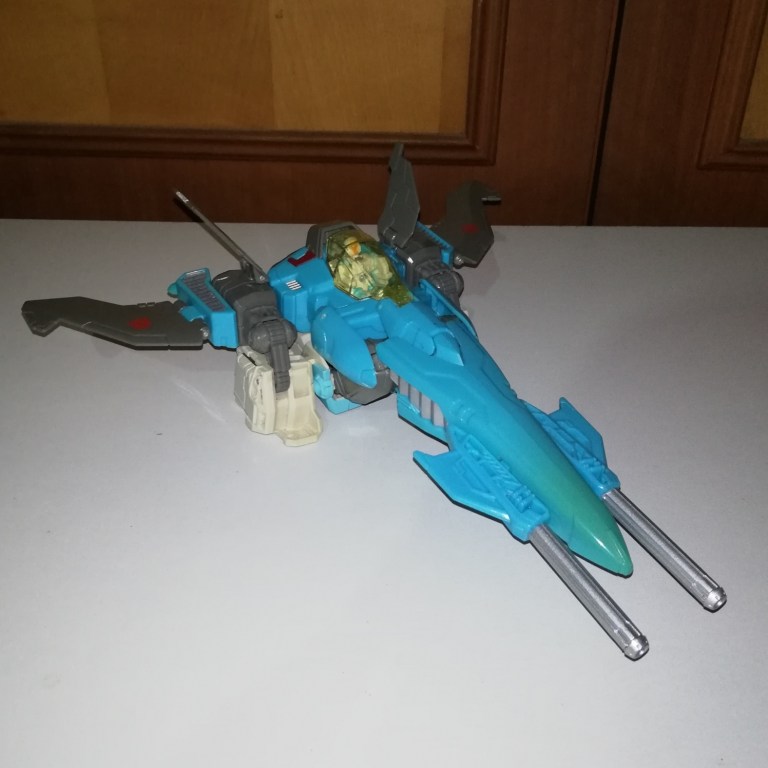 In terms of functionality, no rolling wheels here. But he does have static landing gear and you can plug the guns on the front of the… fuselage I guess? Also, the cockpit is functional and seats the Headmaster.