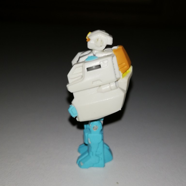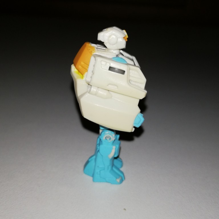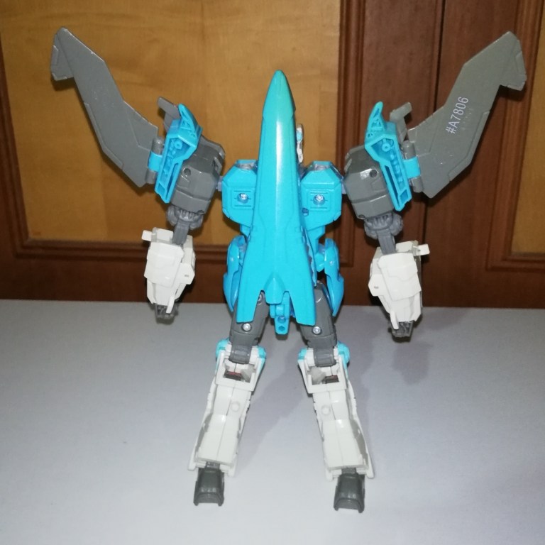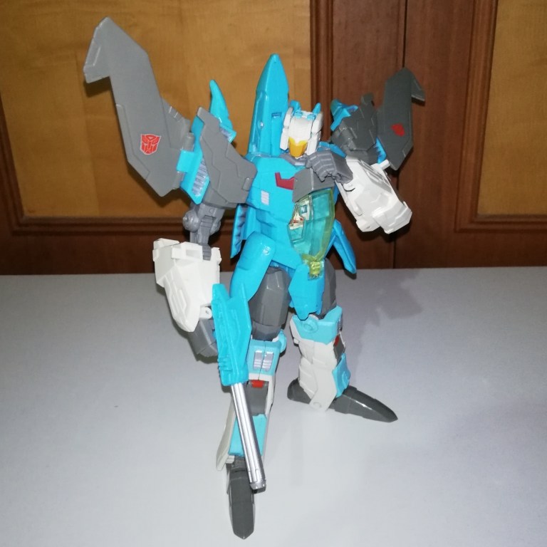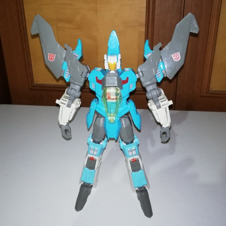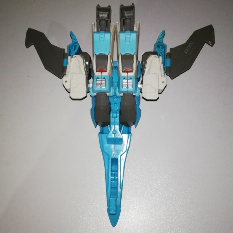 In terms of functionality, no rolling wheels here. But he does have static landing gear and you can plug the guns on the front of the… fuselage I guess? Also, the cockpit is functional and seats the Headmaster.