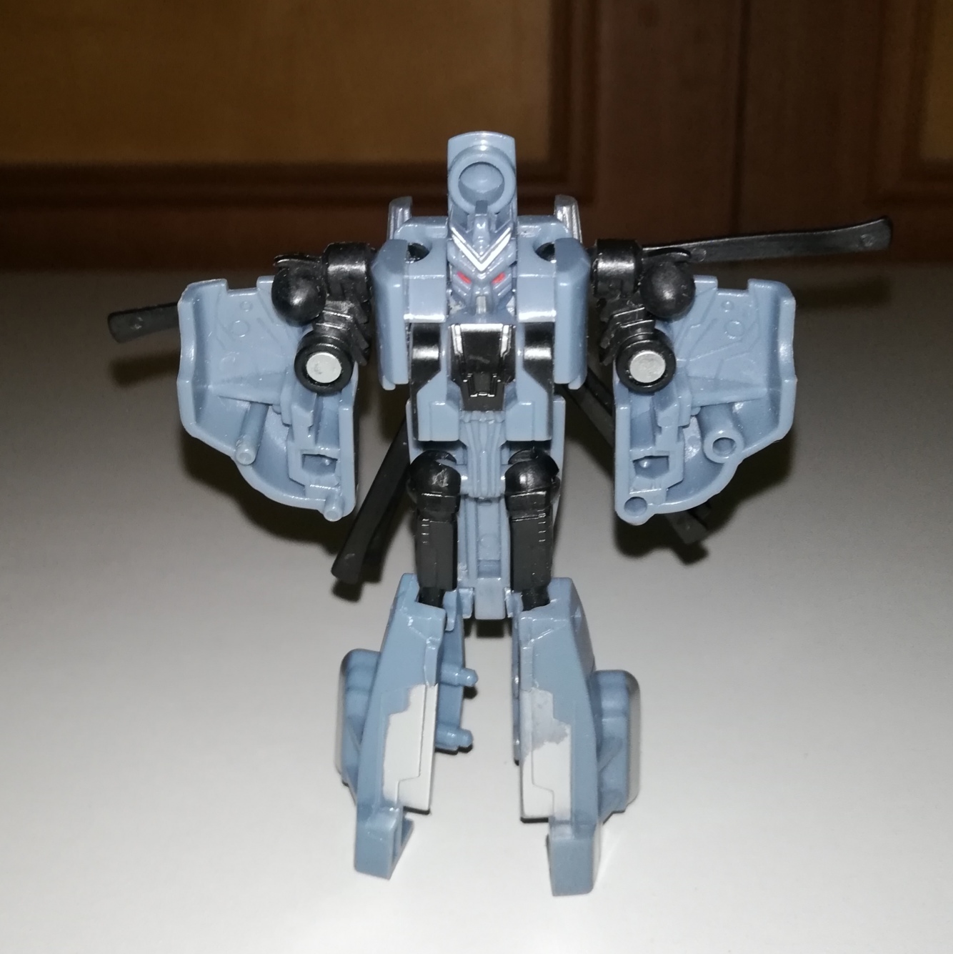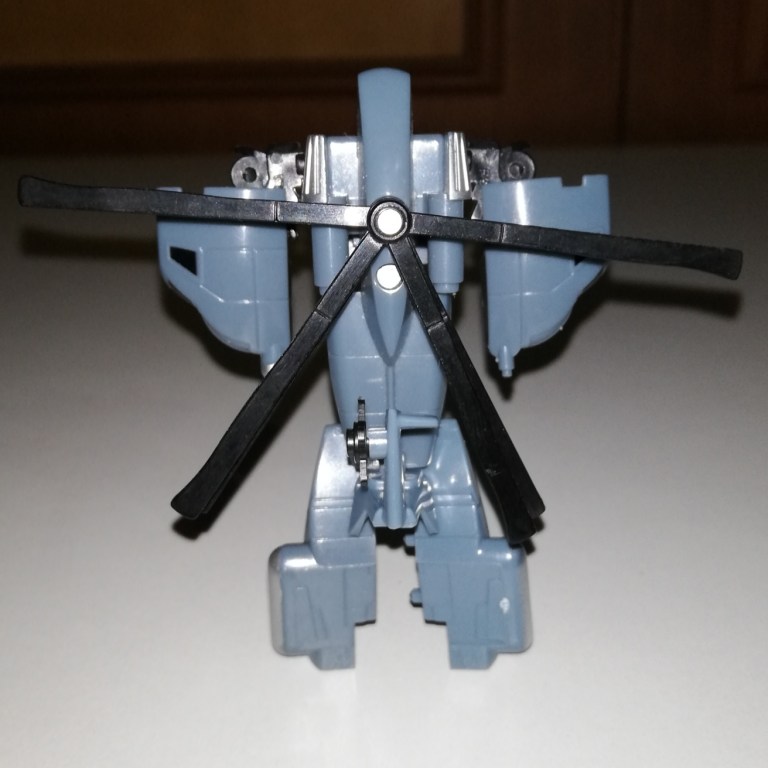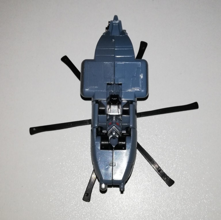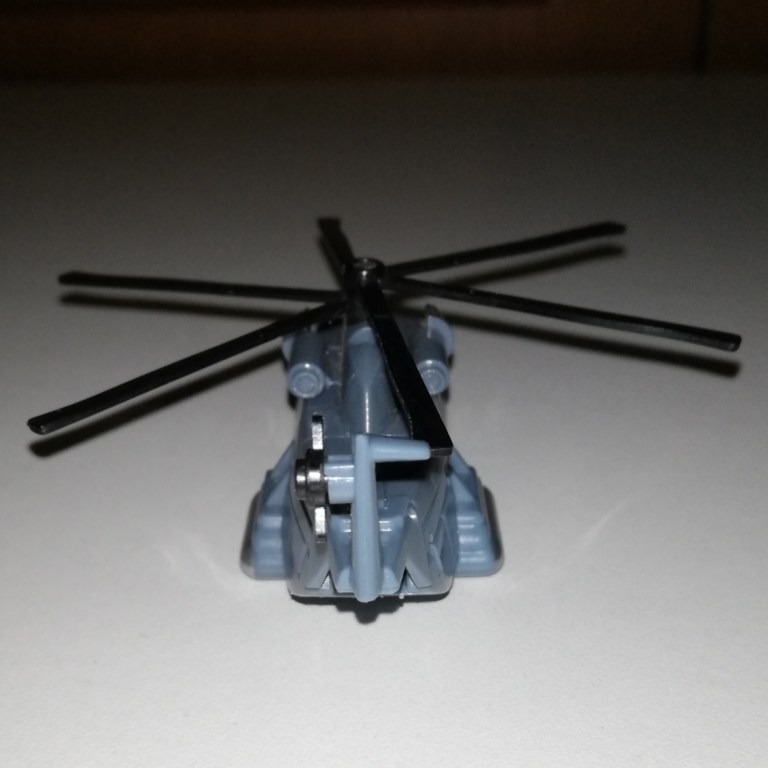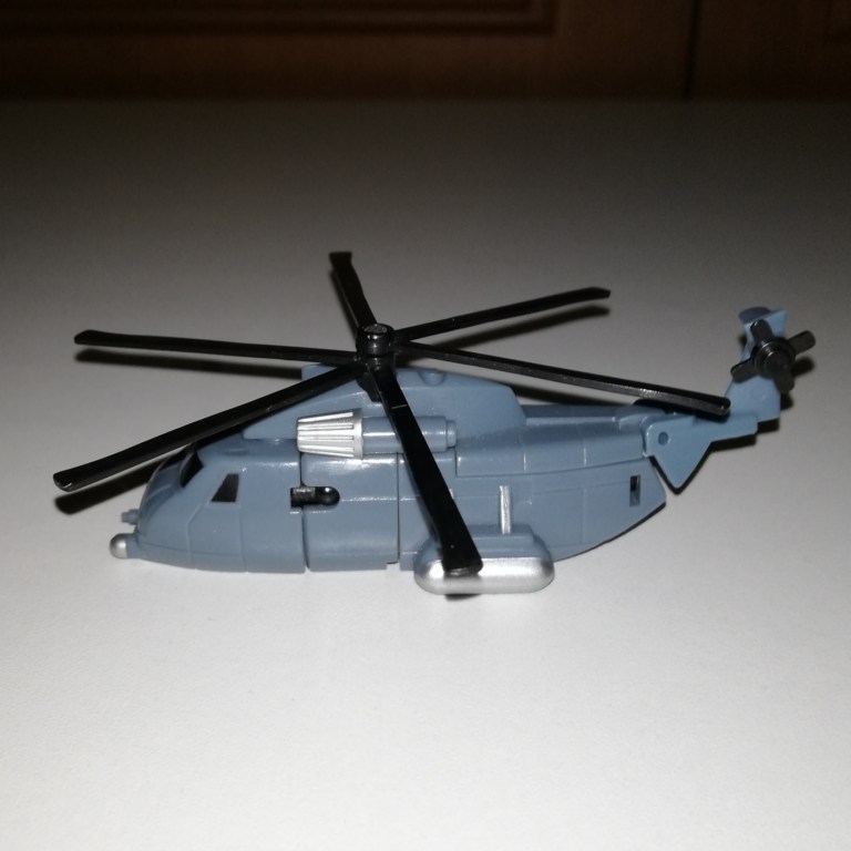 Blackout here’s a helicopter. He’s gray and has spinning rotors. The big one and the tail rotor both spin.