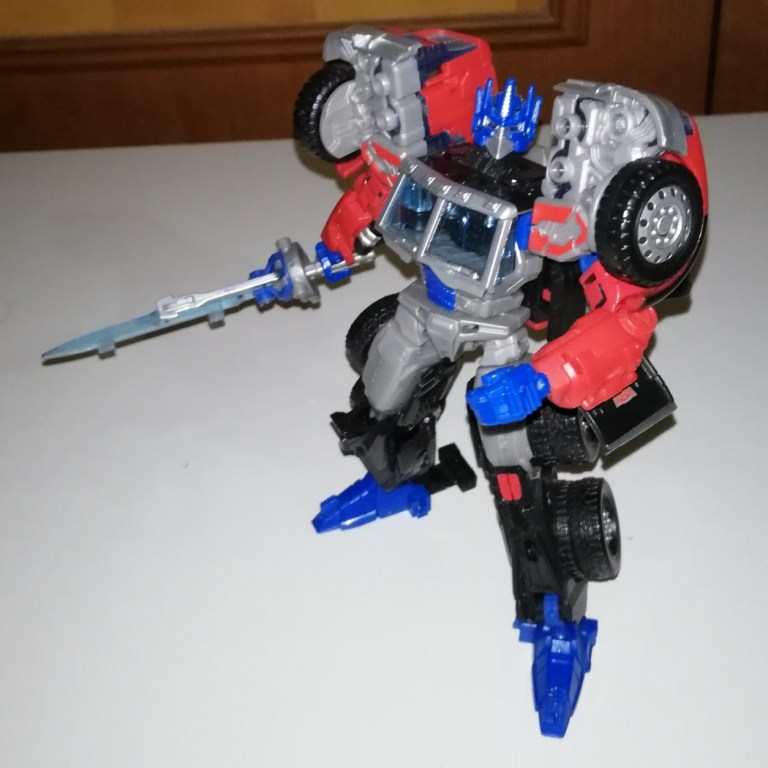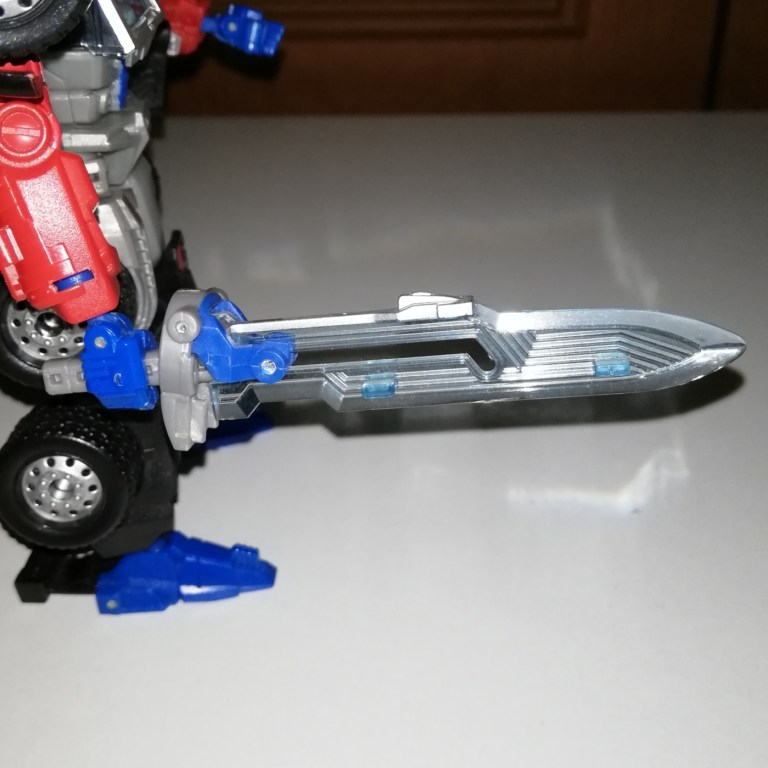 Laser Optimus Prime here has no long range weapon. Just a big honking sword. A laser sword.