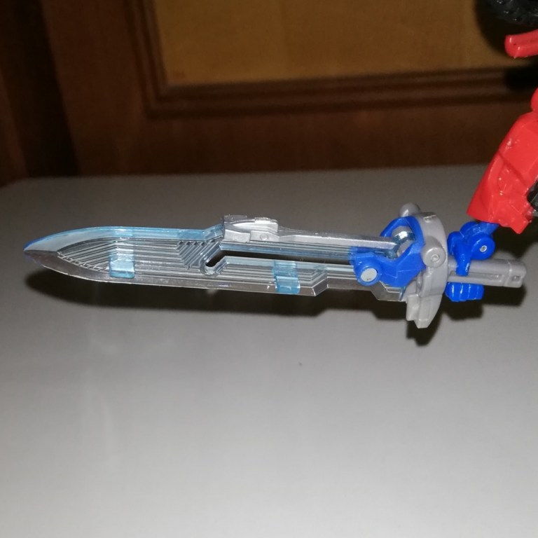 He has a big translucent sword. That is his gimmick. Well that’s not all there is to it. The sword is actually integral to the truck mode. It transforms into the truck hitch for truck mode and makes sure the legs stay tightly joined when transformed for truck mode.