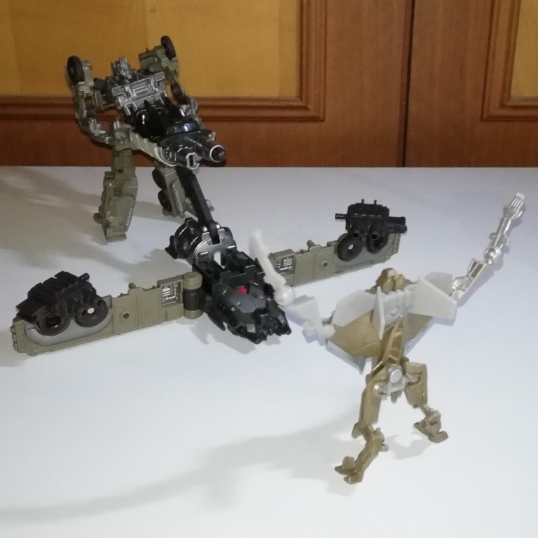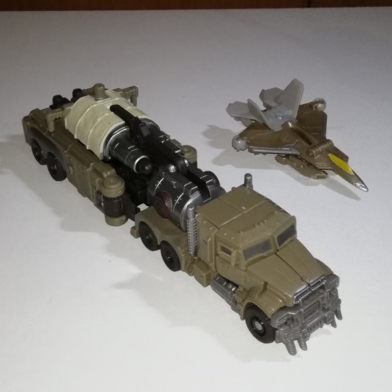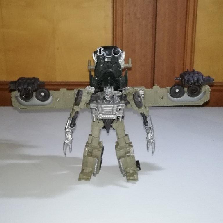 Megatron turned his artillery platform into a jetpack! Man, I wish DOTM had a fight scene where Megatron with a jetpack fought Optimus with a jetpack. The jetpack itself is basically just the base mode as a backpack but it’s still kinda convincing because of the massive wingspan.