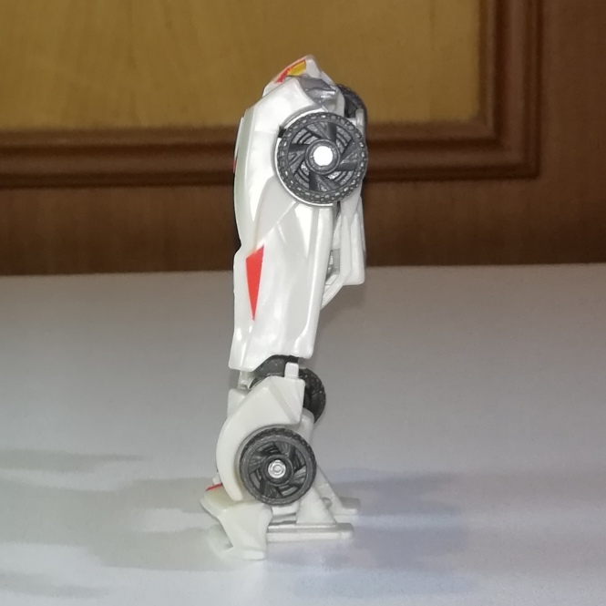 Wheeljack is well-articulated for his size. He’s got ball-jointed shoulders and hips as well as bending knees. His feet also can point down.