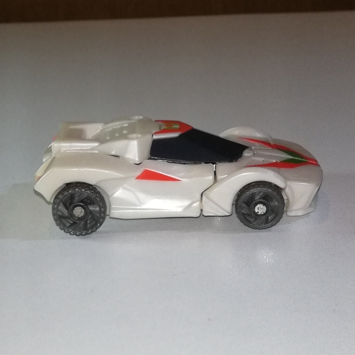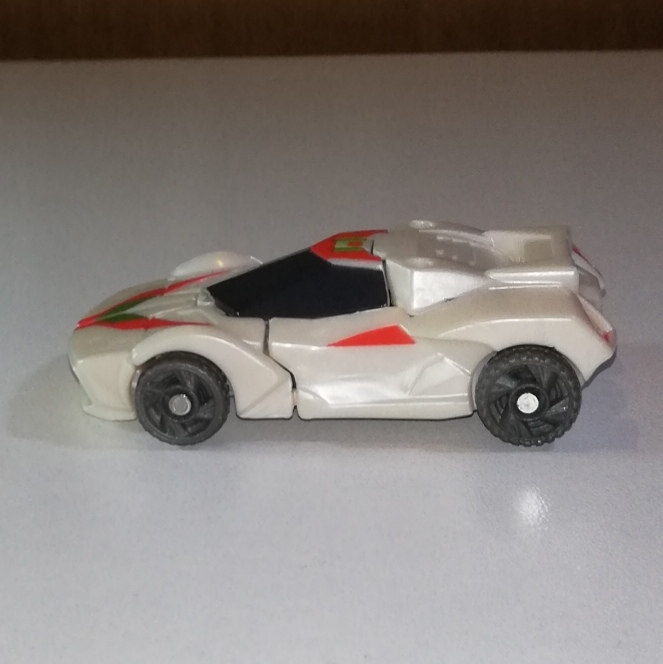 Wheeljack is a white sports car that’s of undetermined model. It’s impressive how much painted detail there is and how little robot mode kibble is visible from every angle of the car mode. The only real sticking point is the gap at the back of the car mode.