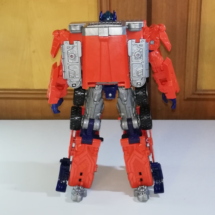 Optimus’s head can rotate a full 360. His arms can rotate as well as go in and out at the shoulders. He has bicep swivels and bending elbows. His hands are on ball joints. His legs can rotate as well as go in and out at the hips. He has thigh swivels and bending knees.