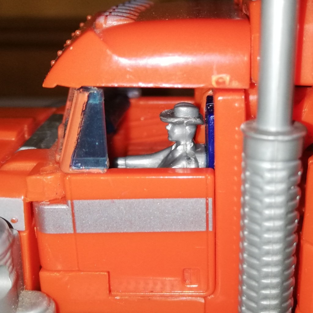 The last trick Optimus has up his sleeve is the smallest gimmick but it’s also my favorite. In truck mode, there’s a detailed interior that has an actual tiny driver that’s wearing a cowboy hat in it. If you open the driver’s side door, he flips away and out of sight.