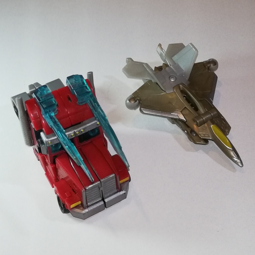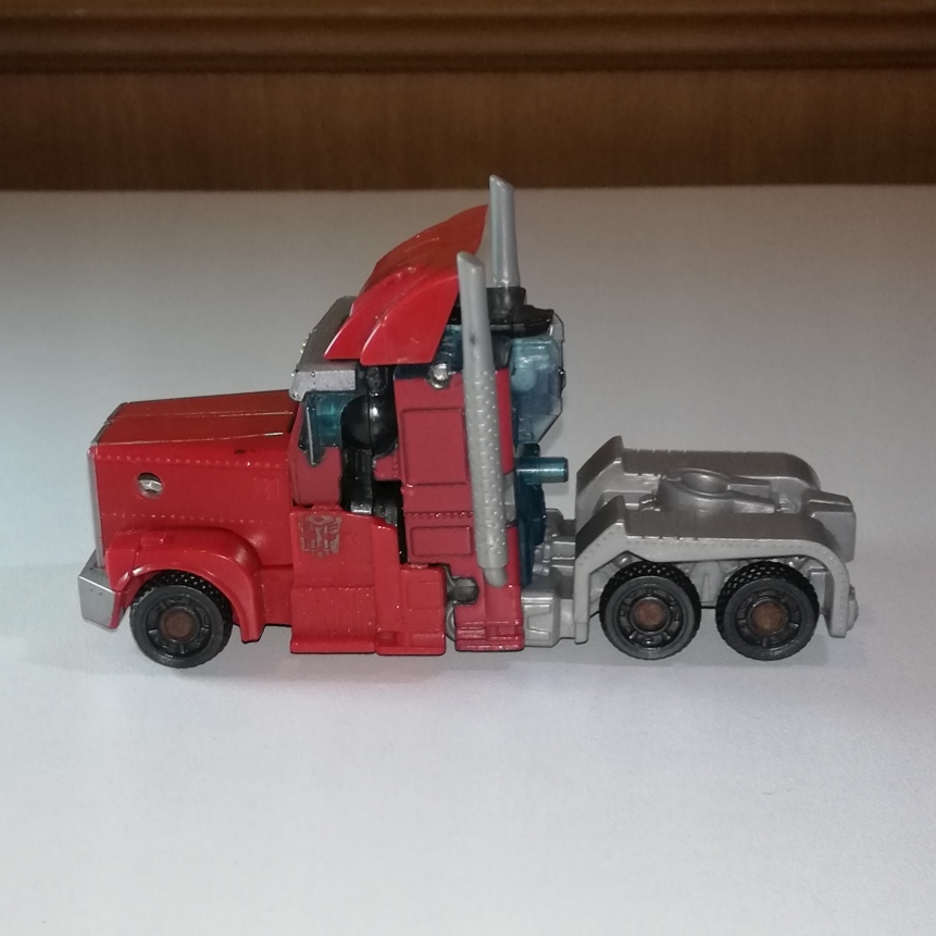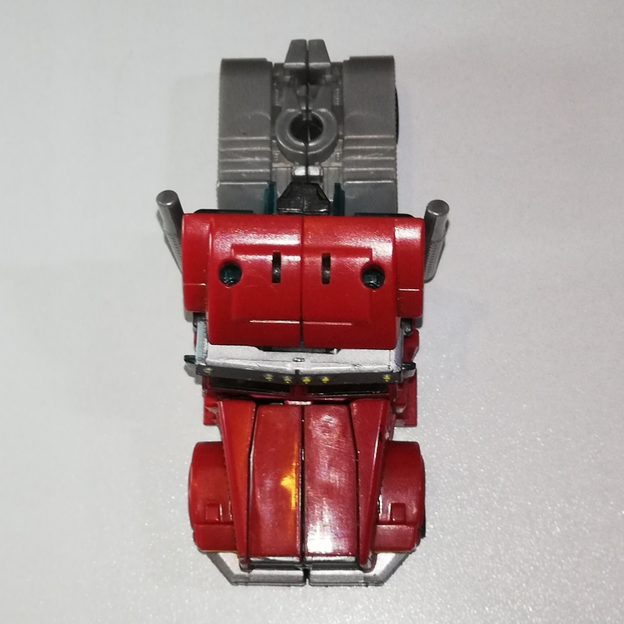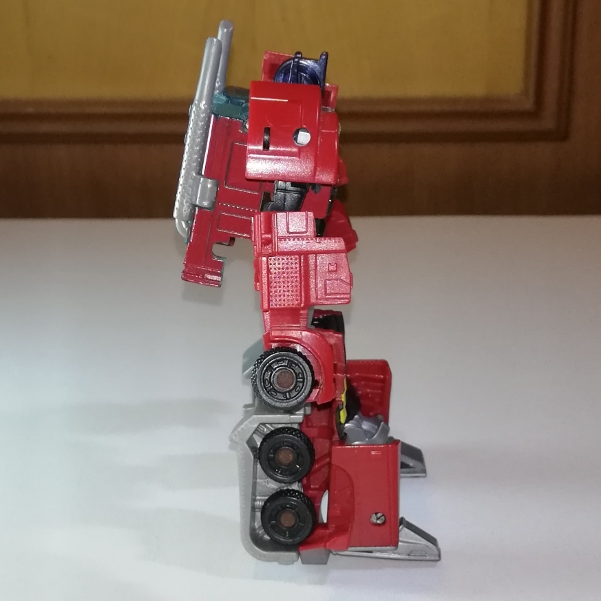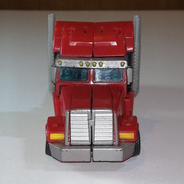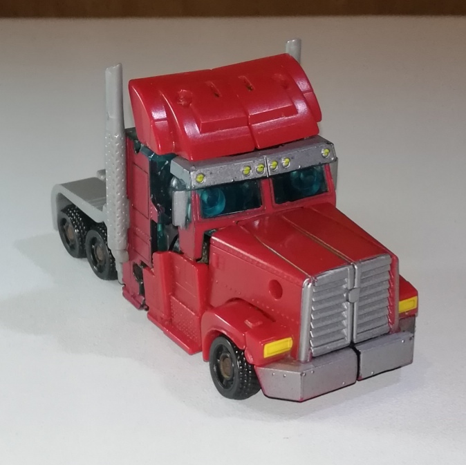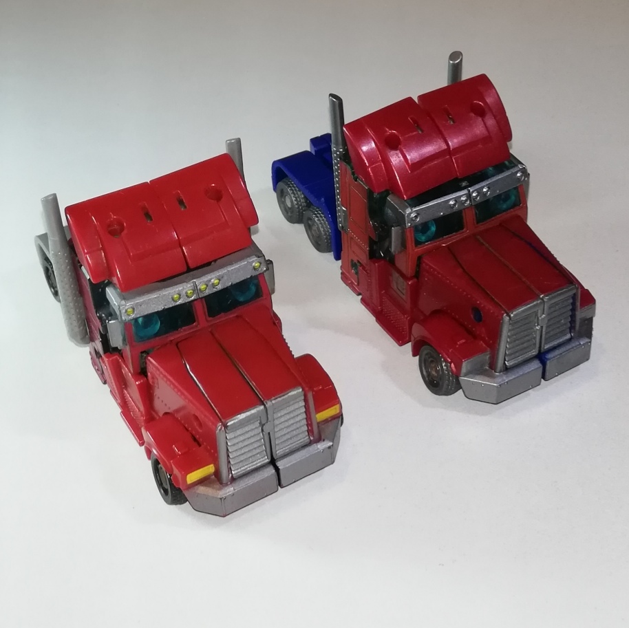 Optimus’s truck mode is barely changed. The only really noticeable difference is that his back end is now grey instead of blue. The other differences are that his shade of red is slightly different, his lights are painted yellow and some of his silver details are arranged differently.