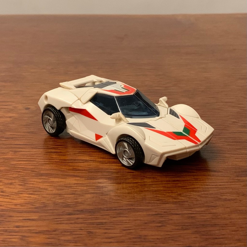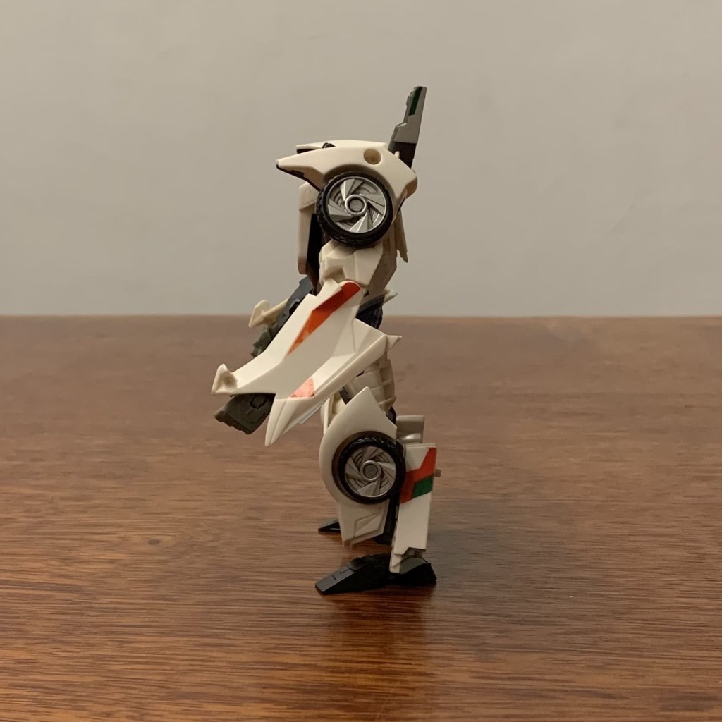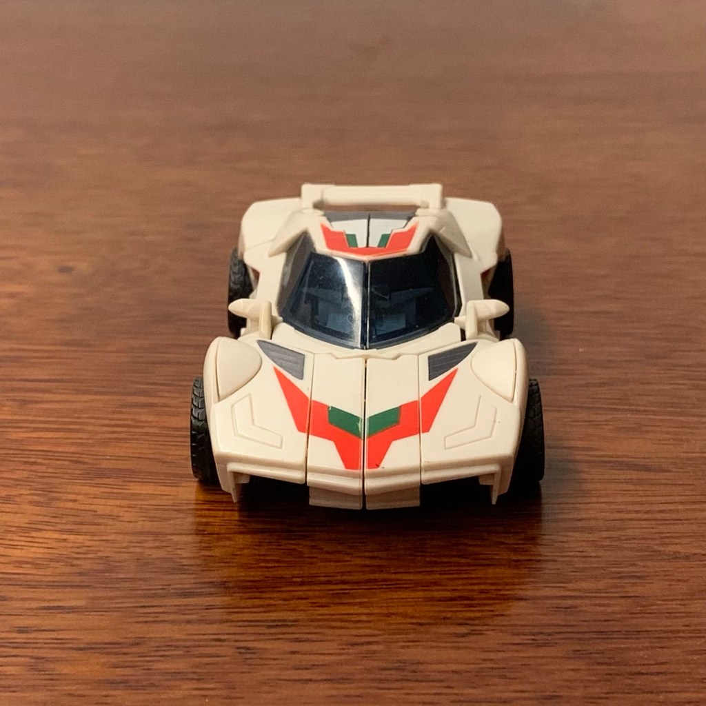 For playability, Wheeljack can roll on all four wheels. He also has plugs to store his swords in car mode… if I had them.