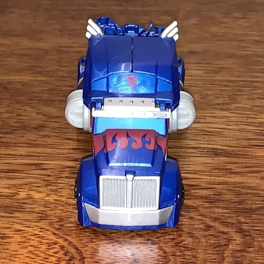 Optimus transforms from truck mode by pressing the silver sun visor thing on top of his windshield. He transforms back into truck mode by flipping the front of his truck mode back into place in one smooth motion. It’s a cool transformation and it’s neat to watch him explode into robot mode or compress down into truck mode automatically.